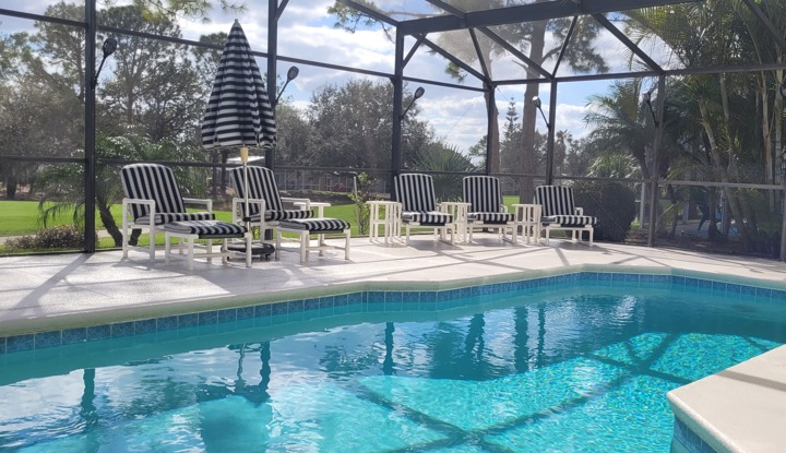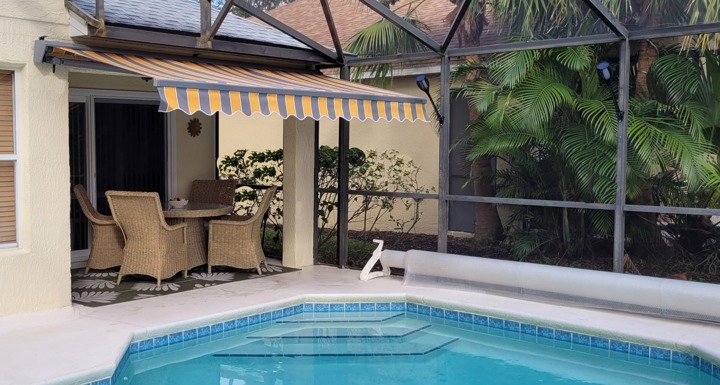 Swim, sunbathe, or relax under the lanai with its electric awning for shade. The extended pool deck is furnished with padded loungers and seating. Pool heating available.